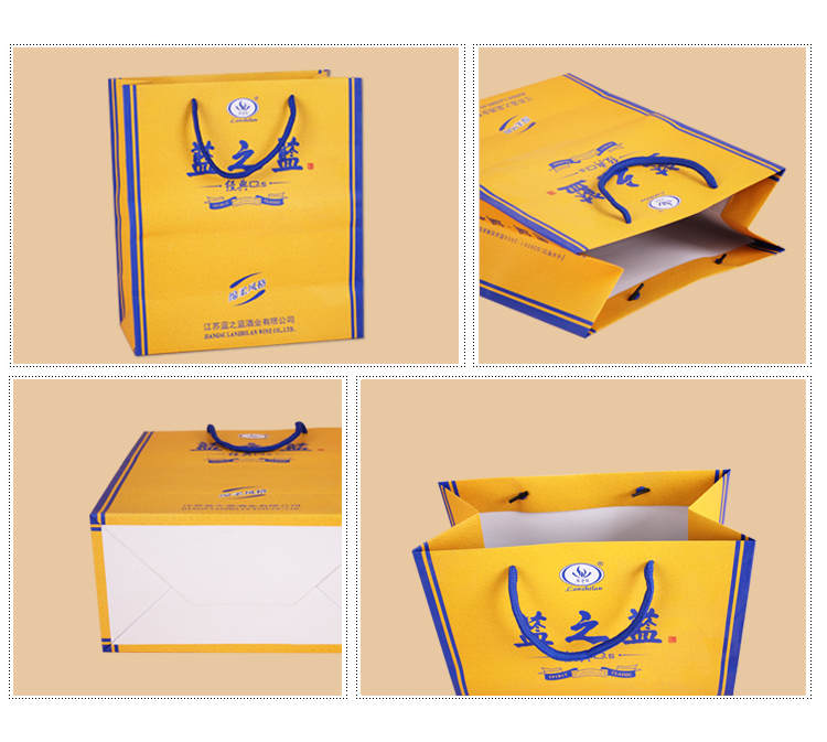 酒水紙袋的紙張一定要挺度好,一般推薦的紙張是210克-230克白卡紙。如果考慮紙袋訂做價格成本因素,也可以選擇灰底白板紙250克-300克。